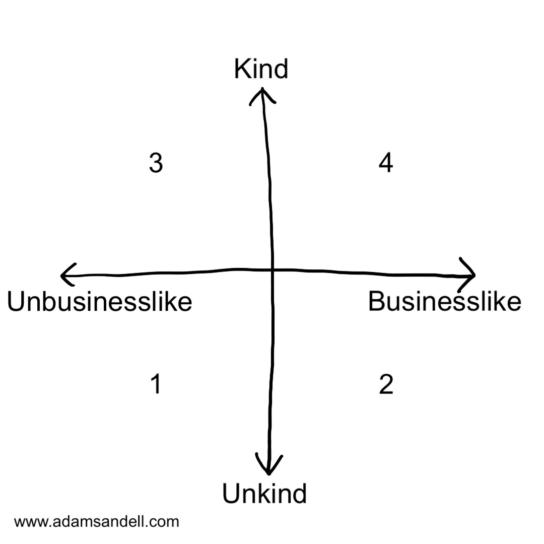 And they’re not alternatives. Being kind doesn’t mean being unbusinesslike, and being businesslike doesn’t mean being unkind. If they were axes on a graph, they’d be at right angles to each other, orthogonal. A team can sit anywhere on this graph (and can move).